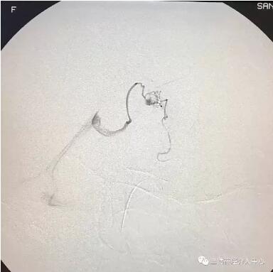 我们经仔细分析及多科室讨论认为动静脉畸形较小,手术切除创伤大,合并动脉瘤再行放射治疗的效果不佳,介入栓塞,但由于供血动脉细小,处于末梢,难度大。术中克服困难,成功将微导管插入畸形团,注胶栓塞,一次治愈,术后患者无不适,查体正常。以下为术前、术中及术后相关影像。