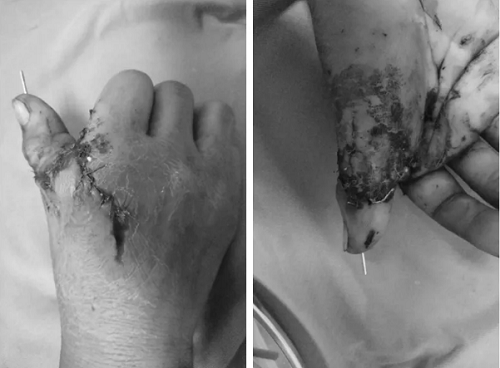 当王嘉飞医生赶到病房时,眼前的画面触目惊心,杨女士的右手大拇指与右手已完全断离,手指的血管、神经、指骨、肌腱的断端露在外面,动脉、神经被抽出约1cm,肌腱被抽出8cm,断了的血管向外喷血,断离的手指已经脱水、干瘪,出现皮下瘀斑。