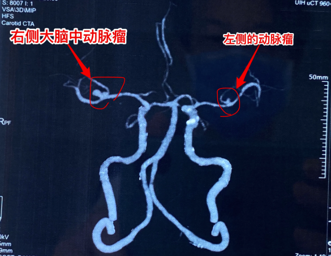 病人左右两侧的大脑中动脉上各有一个动脉瘤,其中右侧的动脉瘤破裂了。所以做手术就夹闭右侧的那个。